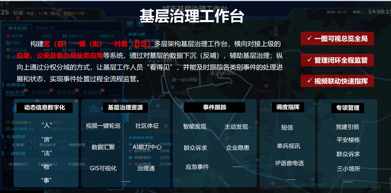 為貫徹習總書記“把更多更好的資源、服務、管理下沉到社區”的基層治理指導方針,充分利用智慧城市已建基礎設施,通過整合資源、數據共享為基層治理管理人員、網格員、平安員等提供日常信息化管理工具。聚焦治安、治理、服務三大領域,通過數據下沉、全事件跟蹤、資源力量實時調度等手段,用數據把人、制度、服務、管理要求連接起來,真正支撐基層的管理工作,實現精細化治理和精準服務,全面提升社區的治理與服務現代化水平。